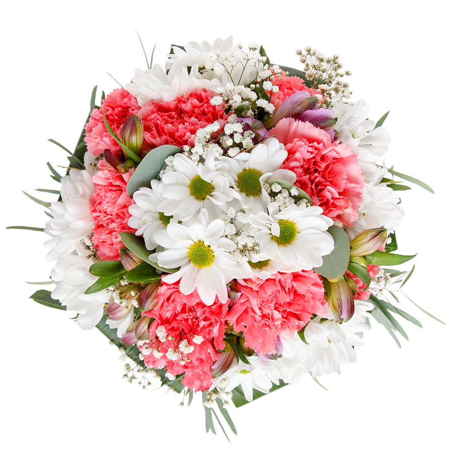 Experience the timeless beauty of our seasonal bouquet, meticulously arranged with a blend of pristine white and gentle pink flowers to convey elegance and grace.